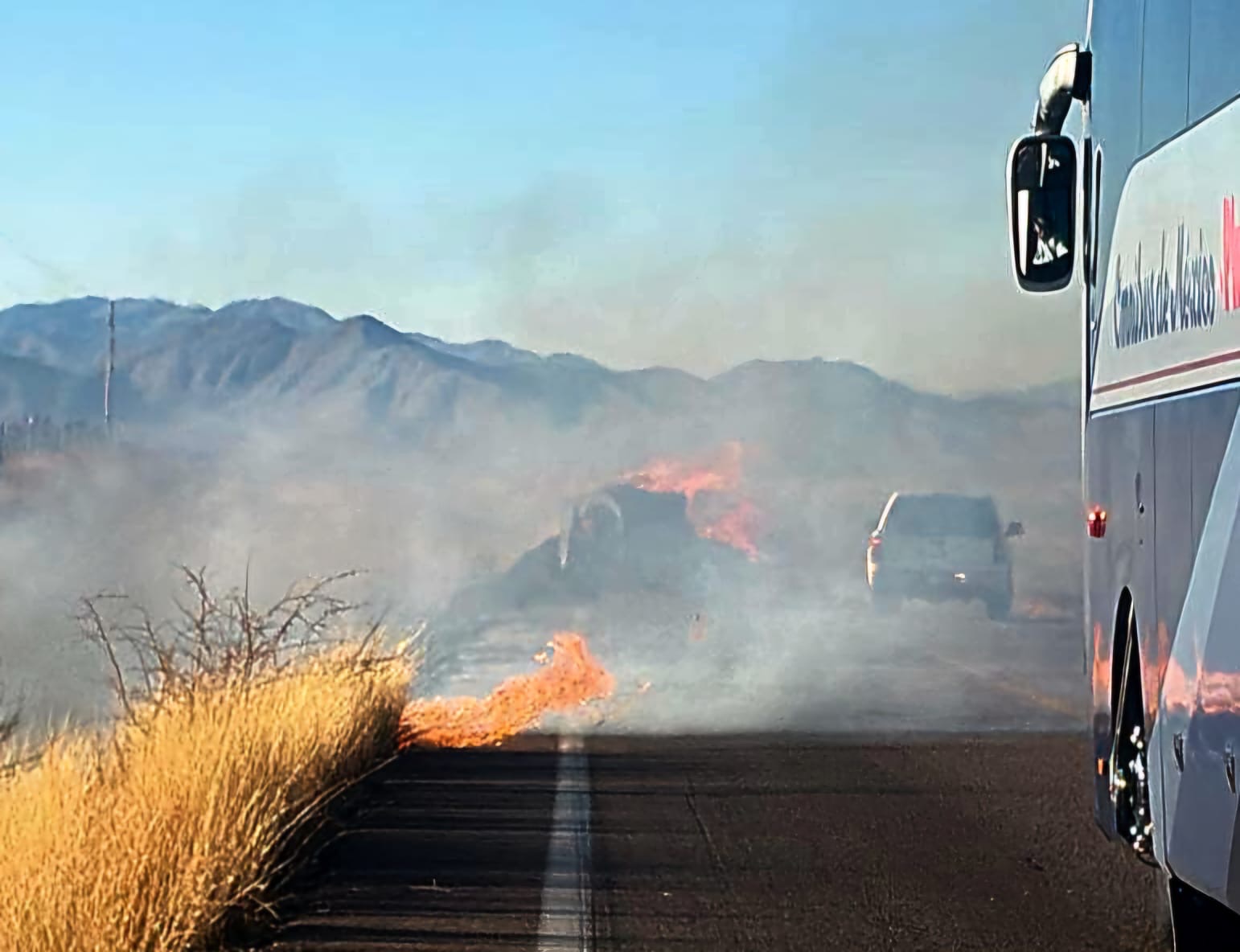 Chihuahua, Chih.-Un remolque cargado de pastura terminó en llamas en el kilómetro 100 de la rúa corta a Parral, dejando una escena que parecía más una parrillada campestre