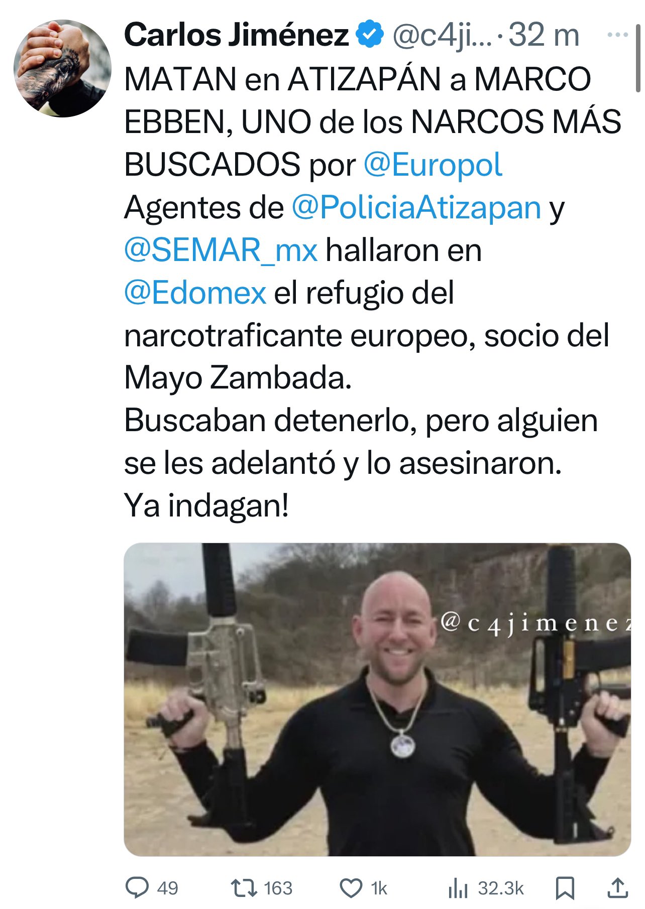 Las autoridades no han confirmado oficialmente la identidad del cuerpo encontrado en Atizapán. La noticia fue difundida por el periodista Carlos Jiménez, quien informó que agentes de la Policía de Atizapán y la Semar hallaron el refugio del narcotraficante europeo, socio de “El Mayo” Zambada. Buscaban detenerlo, pero alguien se les adelantó y lo asesinó. Las investigaciones continúan para esclarecer los detalles de este caso.
