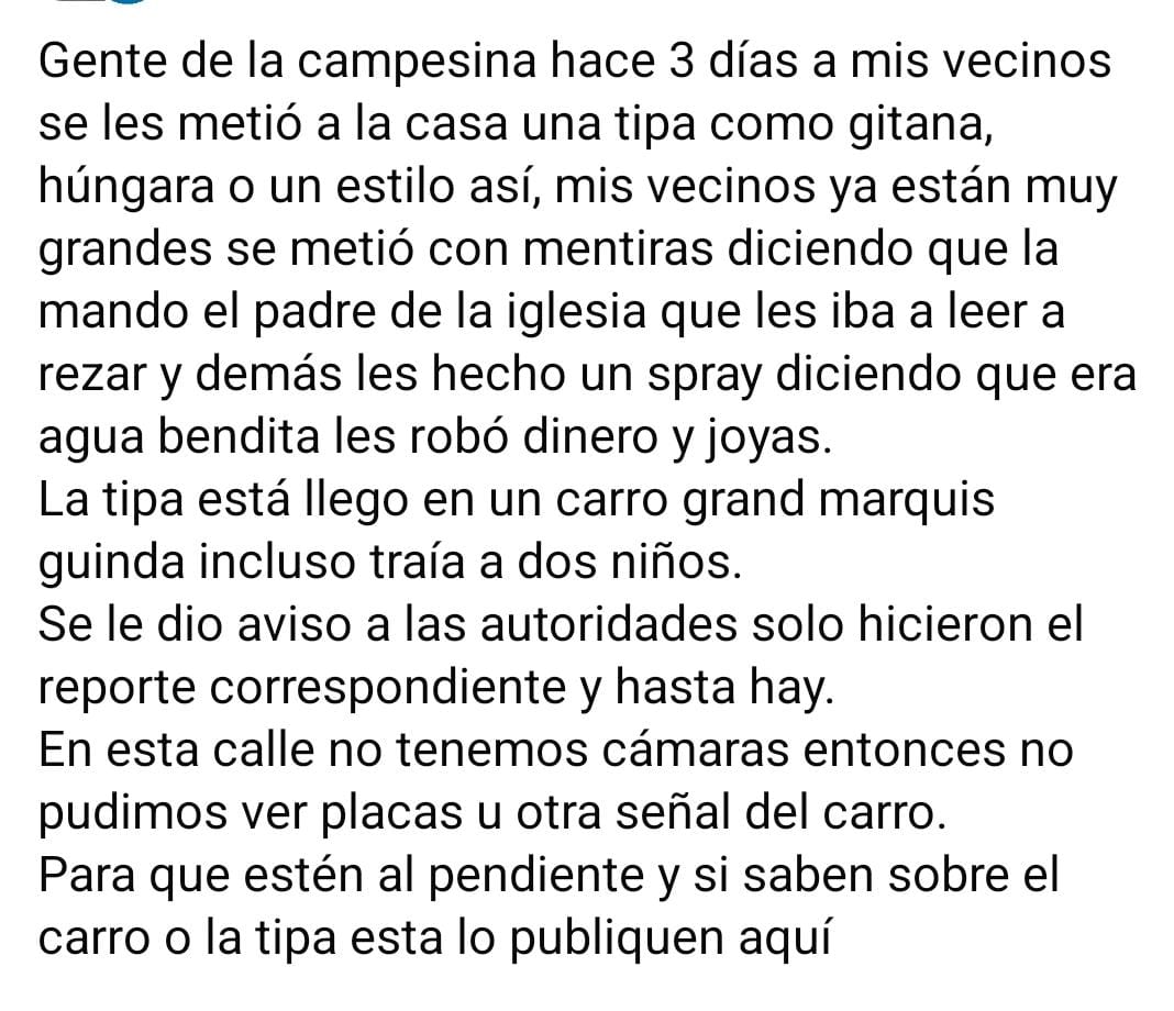 Asimismo mencionan que hace días una tipa con característica de los conocidos húngaros o gitanos arribó al domicilio de una persona de la tercera edad,le aventó spray argumentando que era agua bendita y lo robó, asi mismo señalan que la tipa llegó en un carro Gran Marquis guinda y que incluso traía a dos menores de edad arriba del automóvil