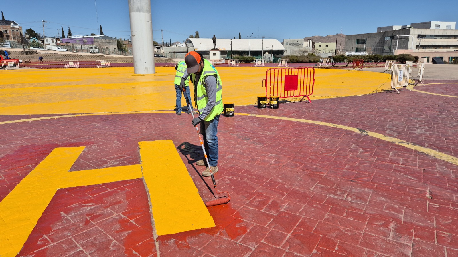 Chihuahua, Chih.- En preparación para el Día de la Bandera, el Gobierno Municipal realizó trabajos de pintura y mantenimiento en la explanada del Parque El Palomar, donde se