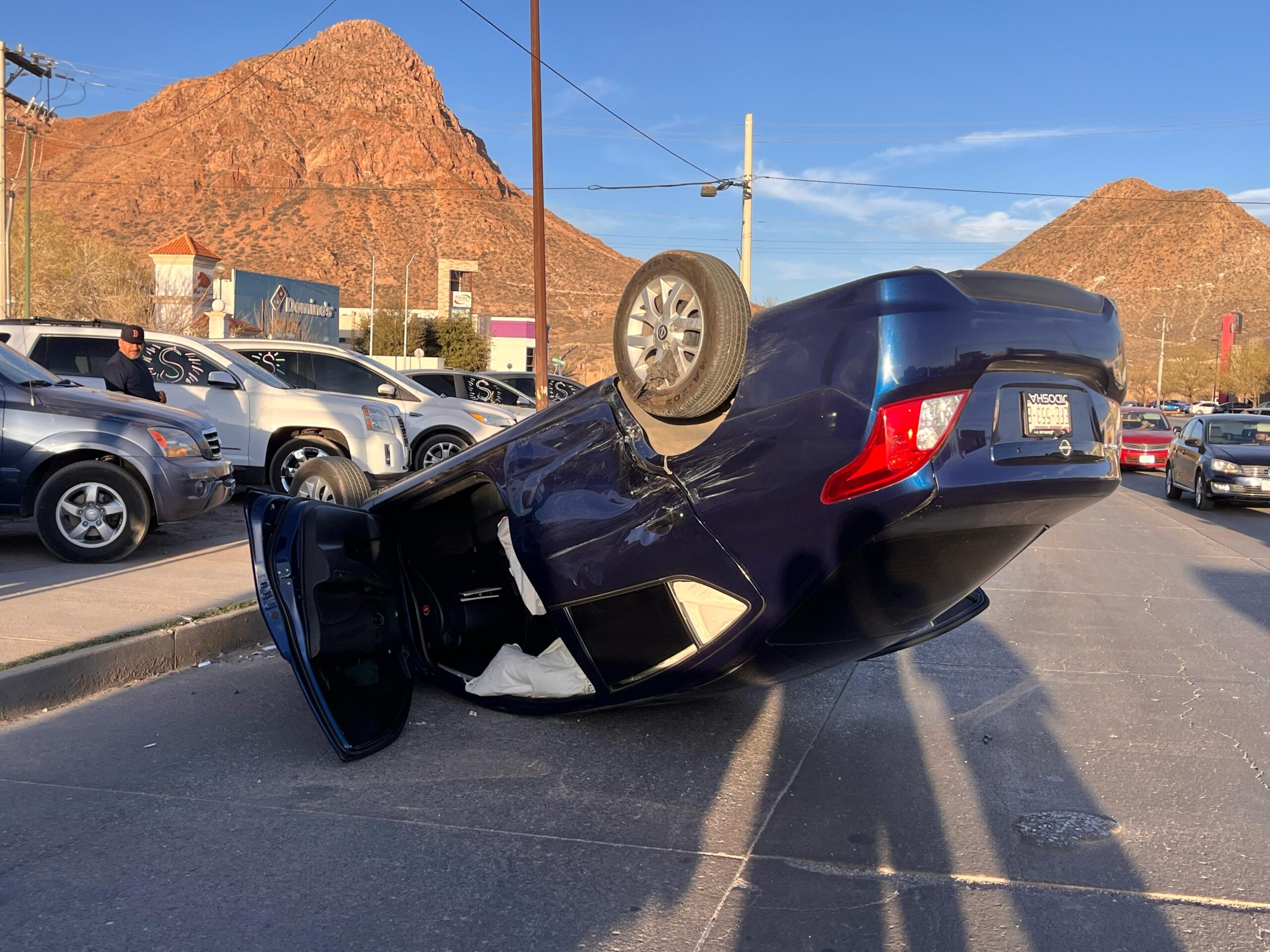 Chihuahua, Chih.- Un fuerte choque con volcadura ocurrió esta tarde en la intersección de la avenida Monte Albán y calle Montes Celeste, dejando como saldo un conductor con