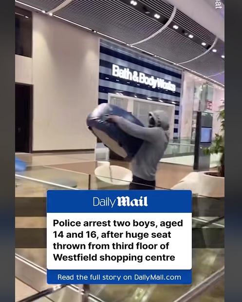 La policía arrestó a dos adolescentes luego de que un asiento de gran tamaño fuera arrojado desde el tercer piso de un centro comercial Westfield, cayendo a solo