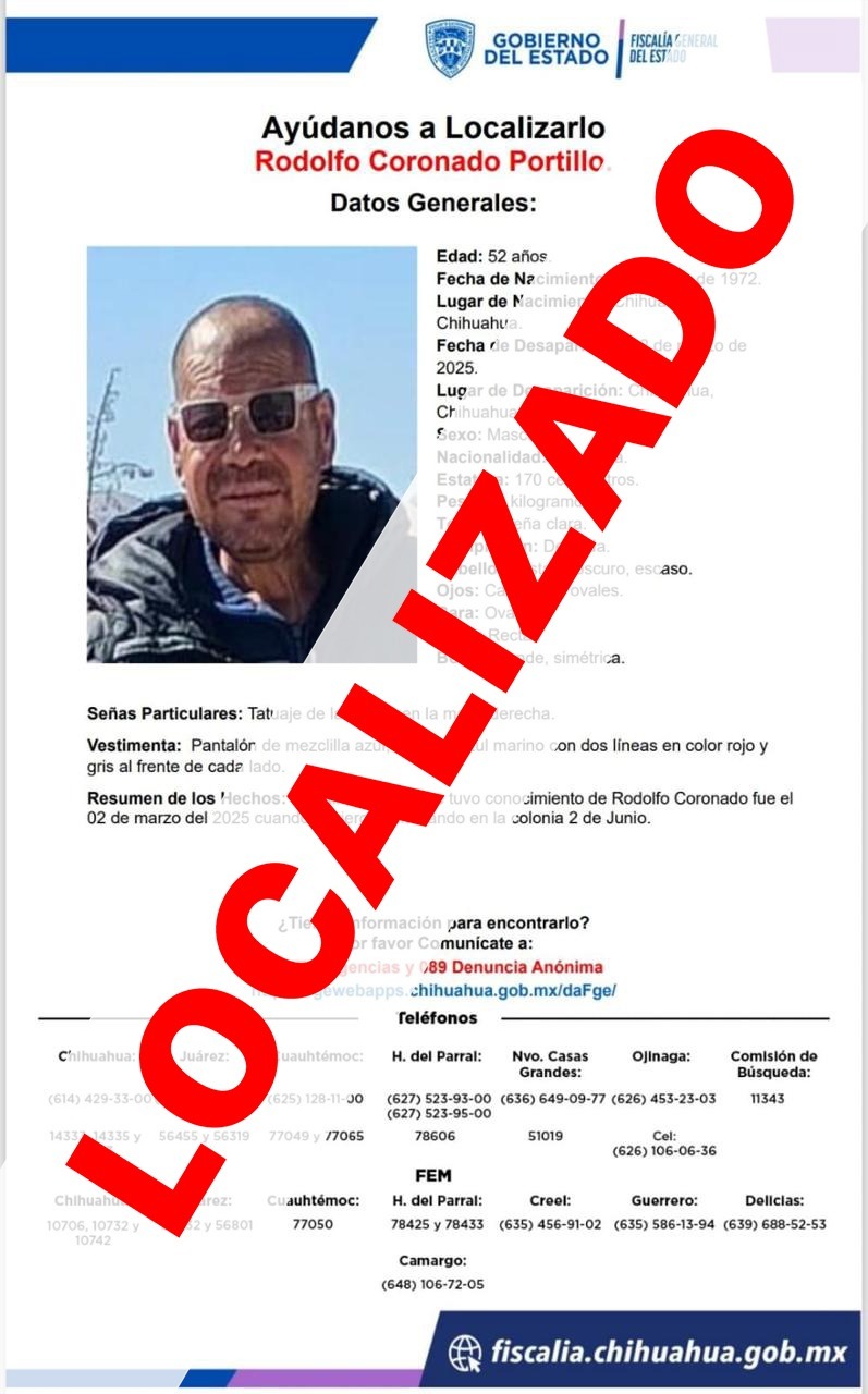 En el caso de Rodolfo C. P., de 52 años de edad, era buscado desde el pasado domingo 02 de marzo, en la ciudad de Chihuahua y fue localizado en la ciudad de Monterrey, Nuevo León.