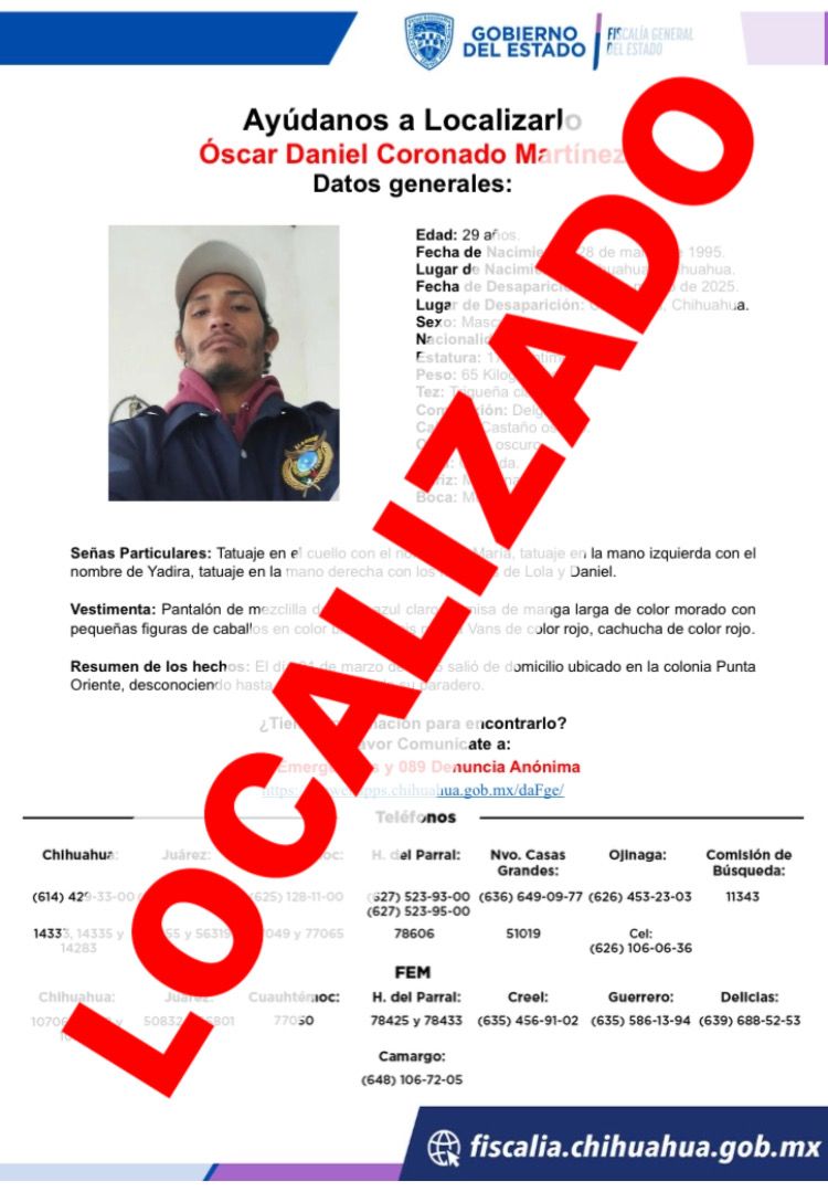 Mientras que, Oscar Daniel C. M., de 29 años de edad, quien era buscado desde el pasado sábado 01 de marzo, regresó a su domicilio y declaró ante las autoridades ministeriales que se encontraba sano y salvo, y en ningún momento fue víctima de algún delito.