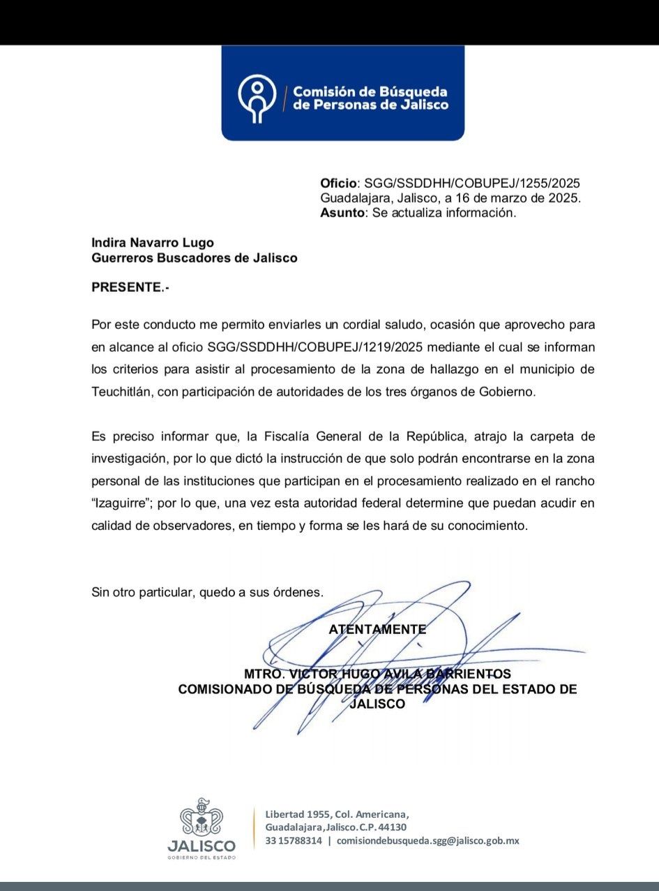 El documento oficial de la Comisión de Búsqueda de Personas de Jalisco, firmado por su comisionado Víctor Hugo Ávila Barrientos, confirma que la FGR atrajo la carpeta de investigación y que solo permitirá el acceso a personal de las instituciones encargadas del procesamiento en la zona. Sin embargo, el colectivo enfatizó que esta medida los deja fuera de un caso que han trabajado desde el inicio, por lo que exigen transparencia y acceso como observadores.
