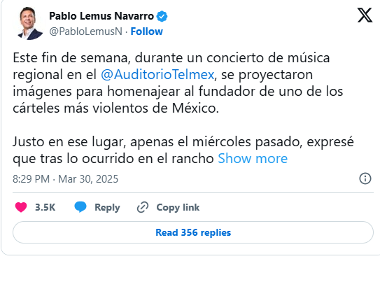Jalisco – El gobernador de Jalisco, Pablo Lemus, rechazó este domingo el homenaje de la banda “Los alegres del barranco” hacia Nemesio Oseguera Cervantes, “El Mencho” y líder del Cártel Jalisco Nueva Generación (CJNG).