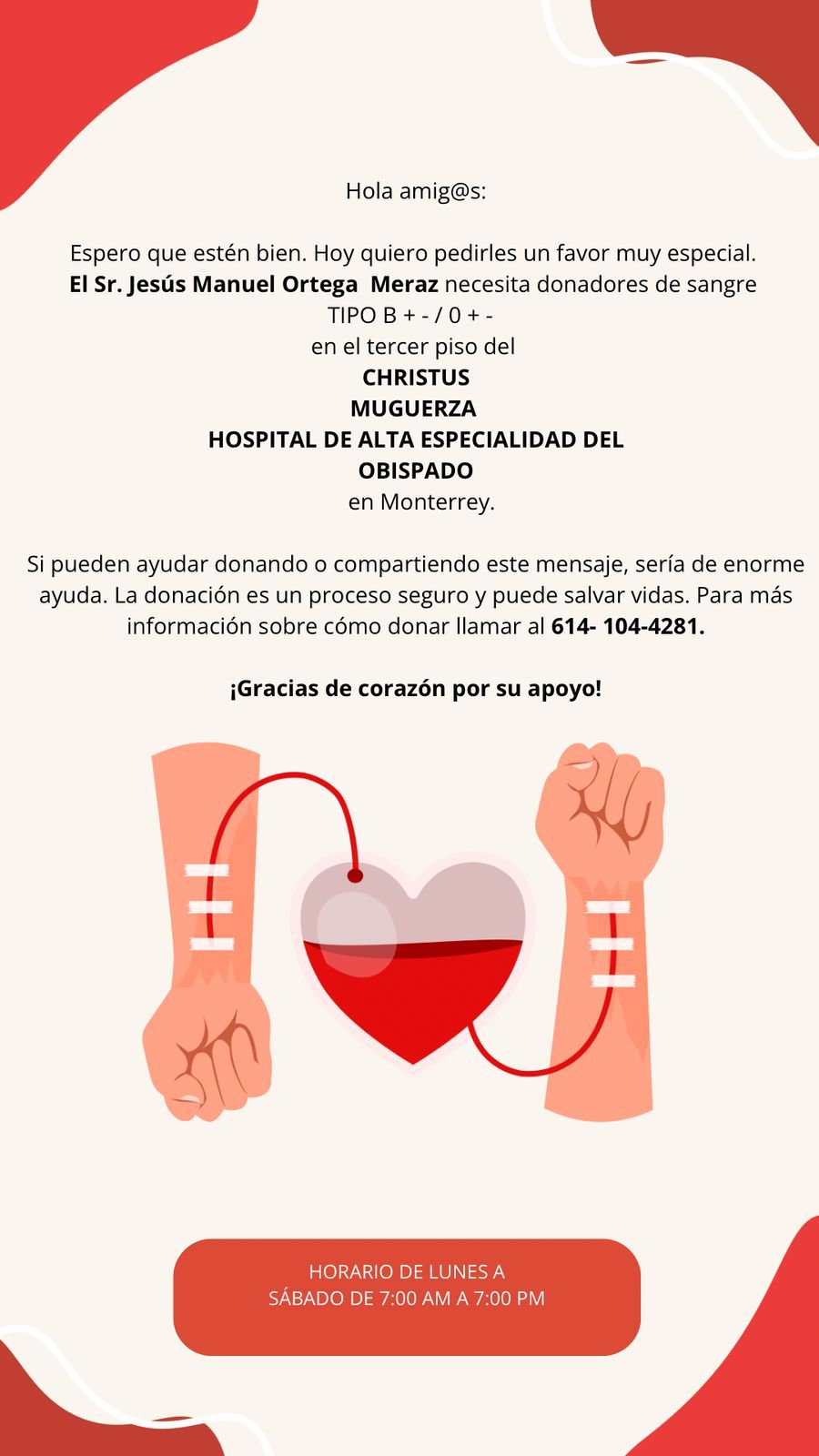 Monterrey.- Se solicita el apoyo de la comunidad para donar sangre al Sr. Jesús Manuel Ortega Meraz, quien lo necesita con urgencia.