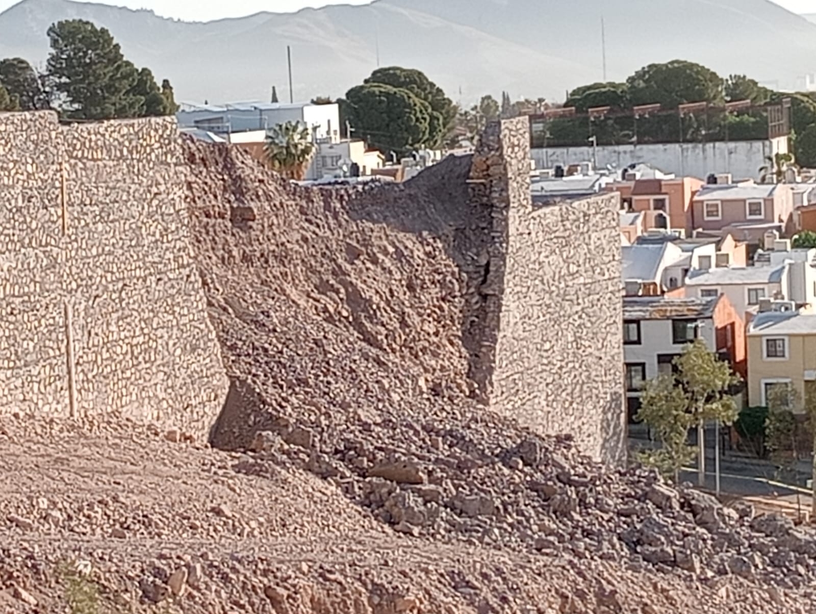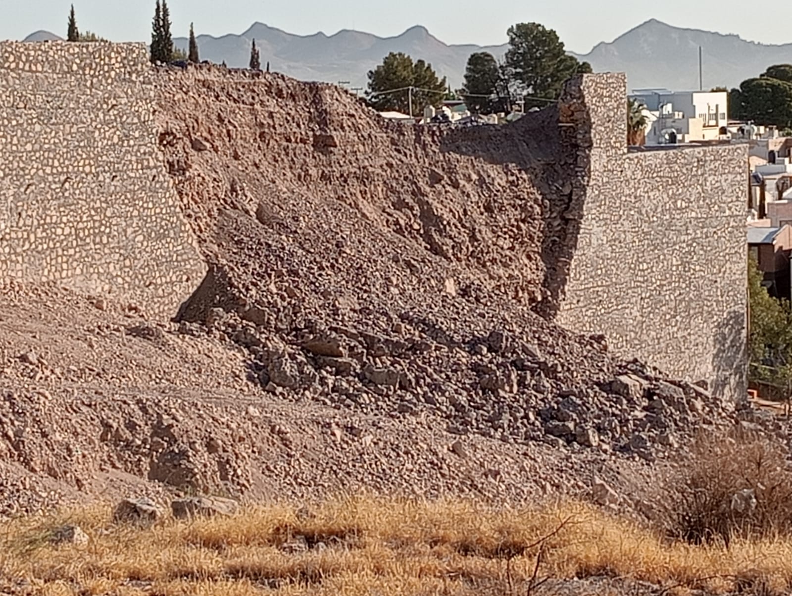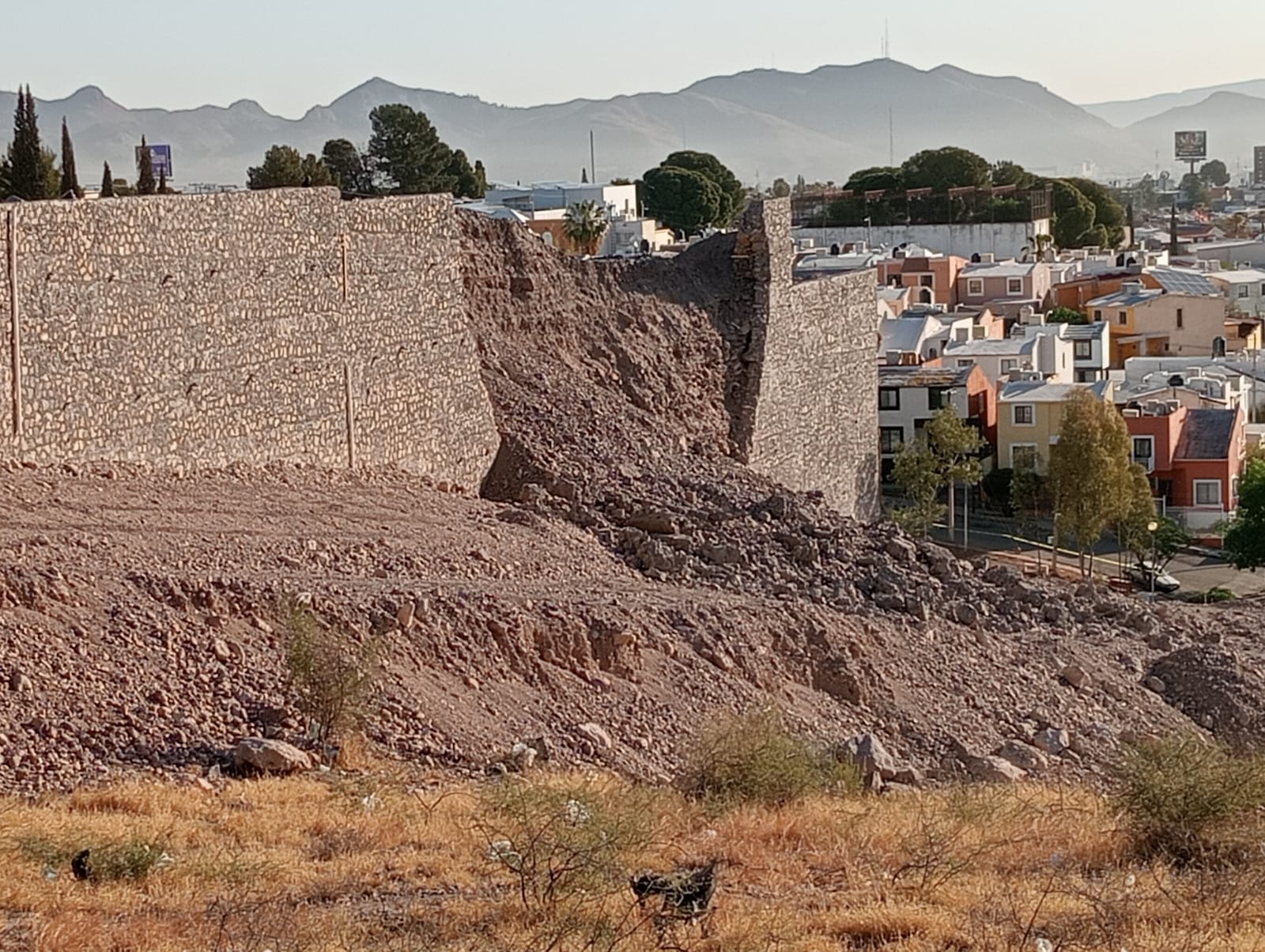 H. Cd. De Chihuahua.- Desde la noche del pasado martes 8 de abril, la Coordinación Municipal de Protección Civil, atendió el colapso del muro de contención ocurrido en un predio ubicado sobre el Periférico de la Juventud y a la mañana siguiente desde primera hora, la Dirección de Desarrollo Urbano y Ecología, supervisó el lugar, para determinar la demolición controlada de las partes que quedaron débiles y que podrían caer de un momento a otro.