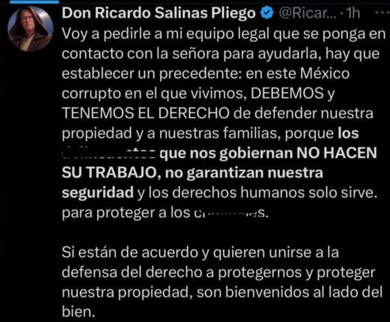 El empresario mexicano cito a través de su cuenta de x lo siguiente; “Voy a pedirle a mi equipo legal que se ponga en contacto con la señora para ayudarla, hay que establecer un precedente: en este México corrupto en el que vivimos, debemos y tenemos el derecho de defender nuestra propiedad y a nuestras familias, porque los delincuentes que nos gobiernan no hacen su trabajo, no garantizan nuestra seguridad y los derechos humanos solo sirve. para proteger a los criminales.Si están de acuerdo y quieren unirse a la defensa del derecho a protegernos y proteger nuestra propiedad, son bienvenidos al lado del bien”.