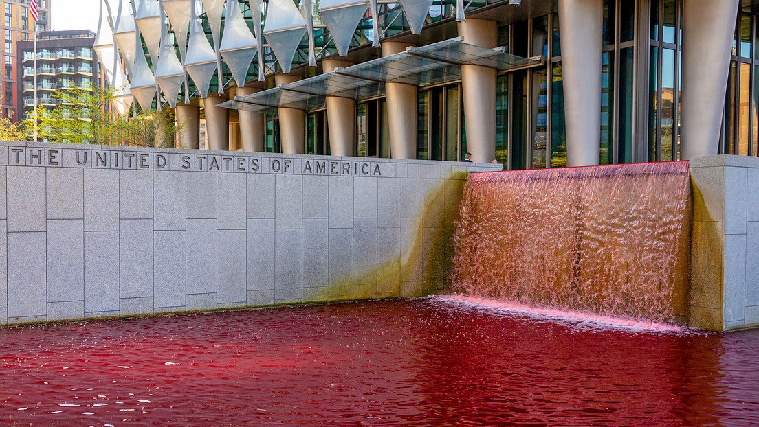 H. Cd de Chihuahua.- Activistas tiñeron de rojo el estanque de la embajada de Estados Unidos en Londres para protestar contra la venta de armas a Israel. Seis