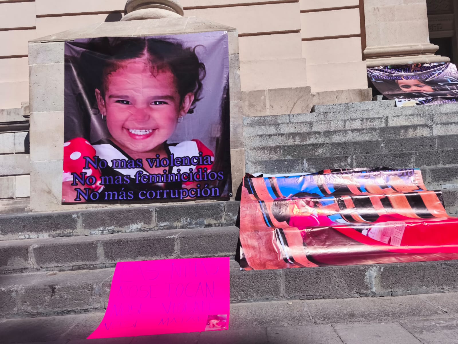 H. Cd de Chihuahua.- Llegaron al centro familiares de Ximena, pequeña que perdió la vida por un tema de violencia familiar y colocaron mantas así como también lonas