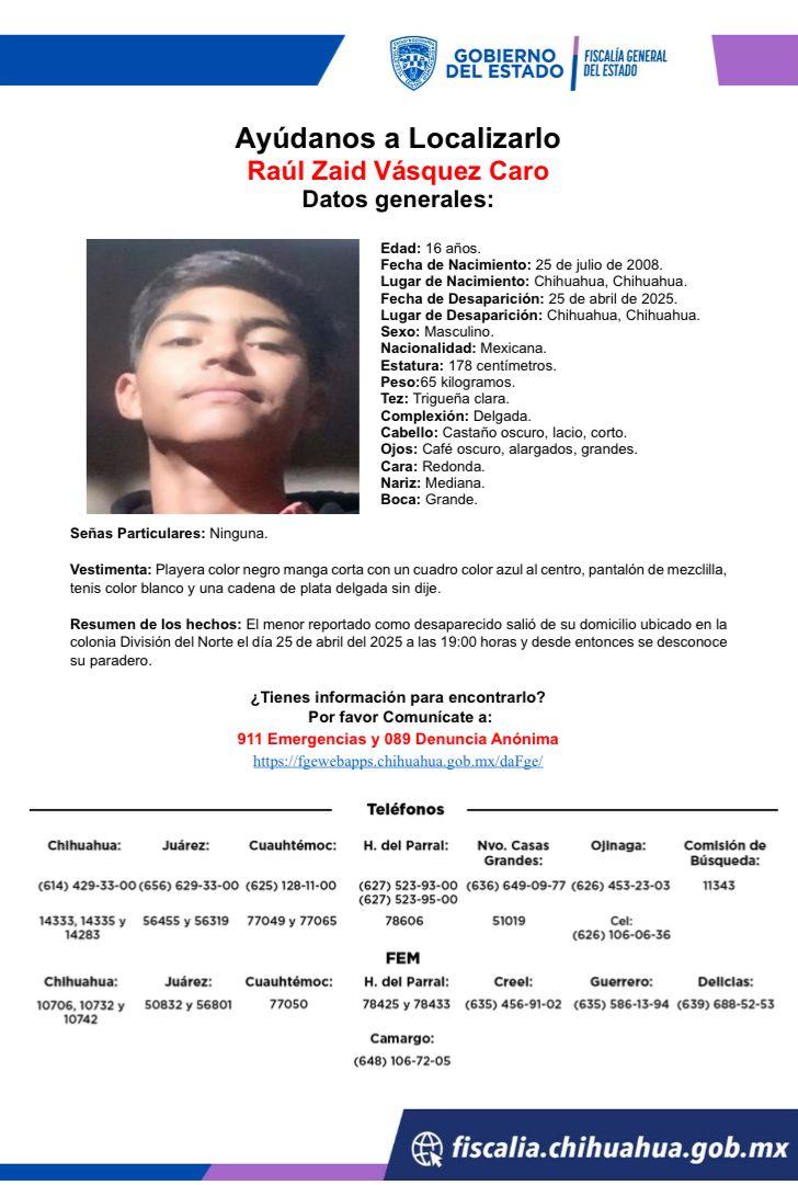 La Fiscalía General del Estado de Chihuahua emitió pesquisas para solicitar el apoyo de la ciudadanía en la localización de Fernando Chacón Núñez y Ramón Octavio Villegas Martínez,