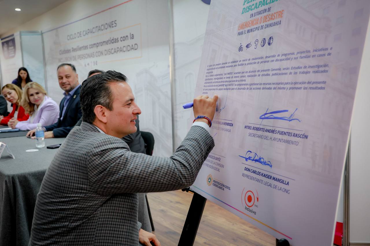H. Ciudad de Chihuahua, Chih., a 12 de mayo de 2025.- El alcalde Marco Bonilla encabezó una firma de convenio con la ONG Inclusiva de Chile con el objetivo de fortalecer la inclusión de personas con discapacidad en protocolos de emergencia y construcción de ciudades resilientes.
