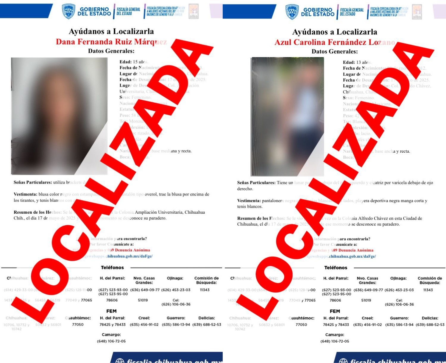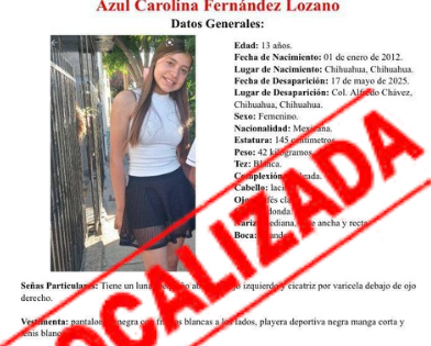Noticias, Chihuahua.- La Fiscalía General del Estado confirmó que Azul Carolina Fernández Lozano, de 13 años, ya fue localizada con bien y se encuentra de regreso con su