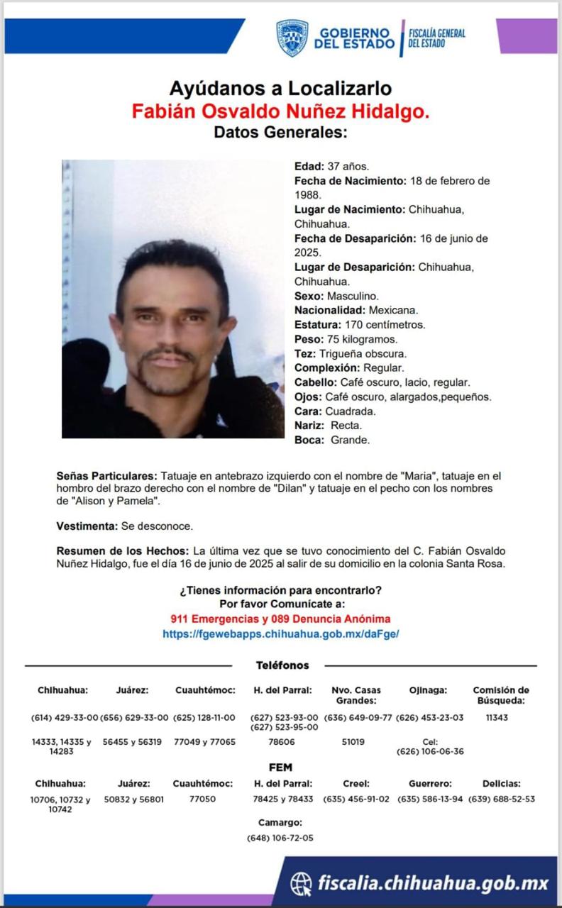LAS AUTORIDADES ESTATALES han activado un protocolo de búsqueda para Fabián Osvaldo Núñez Hidalgo, de 37 años de edad, quien fue reportado como desaparecido el 16 de junio