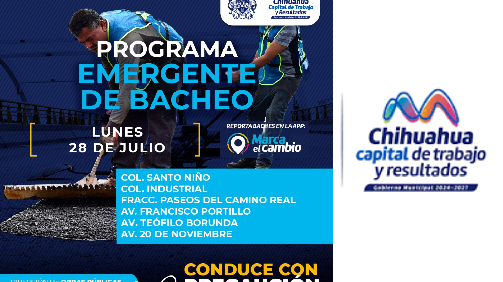 H. Cd de Chihuahua.- El Gobierno Municipal, a través de la Dirección de Obras Públicas, realizará bacheo este 28 de julio, mediante el programa emergente, en las colonias