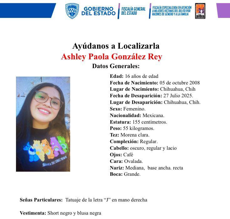 La Fiscalía General del Estado emitió una alerta de búsqueda para localizar a Ashley Paola González Rey, una adolescente de 16 años que fue vista por última vez