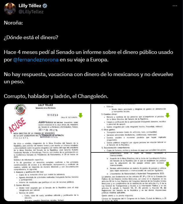 “¿Dónde está el dinero? Hace 4 meses pedí al Senado un informe sobre el dinero público usado por Fernández Noroña en su viaje a Europa”, cuestionó la panista. Acto seguido, lo acusó de vacacionar con los recursos de los mexicanos y lo calificó como corrupto y ladrón: “No hay respuesta, vacaciona con dinero de lo mexicanos y no devuelve un peso. Corrupto, hablador y ladrón, el Changoleón”, posteó la senadora.