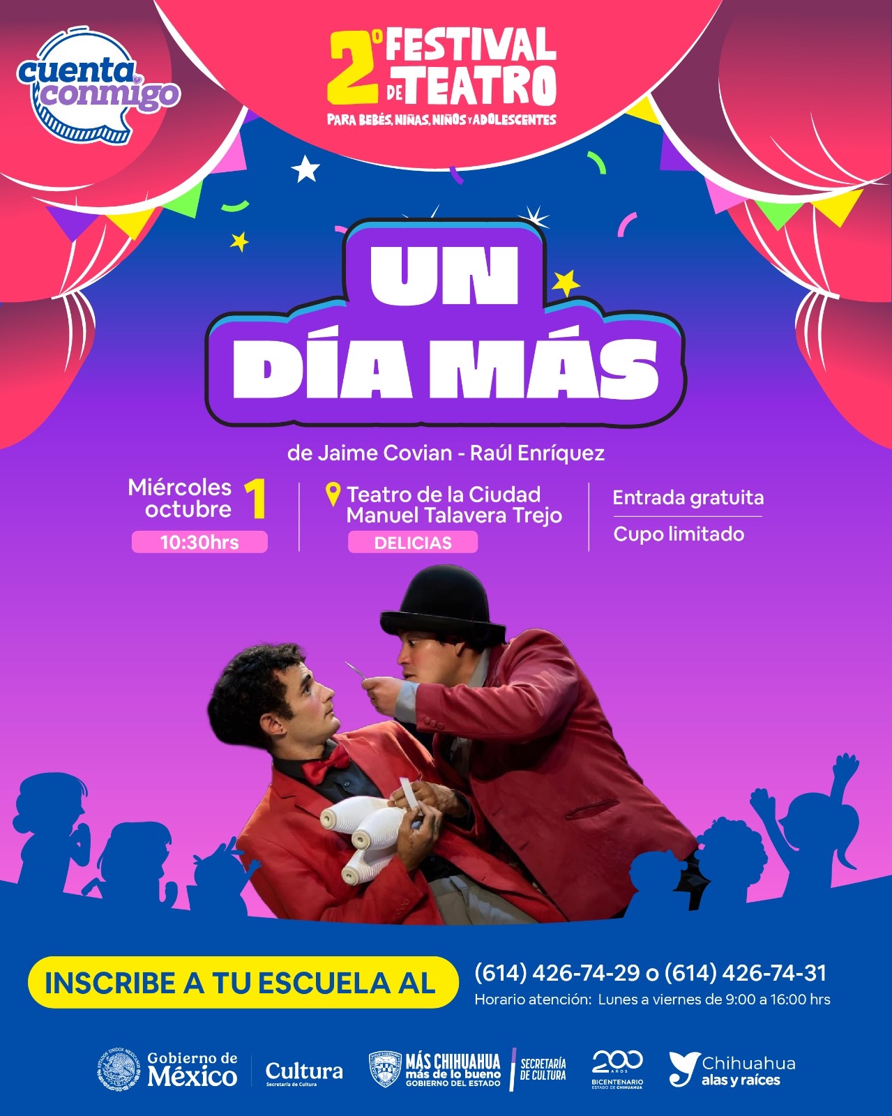 Para finalizar, el 1 de octubre llegará a Delicias al Teatro de la Ciudad “Manuel Talavera Trejo” Jaime Covian y Raúl Enríquez, ofrecerán “Un día más”, en un horario de 10:30.