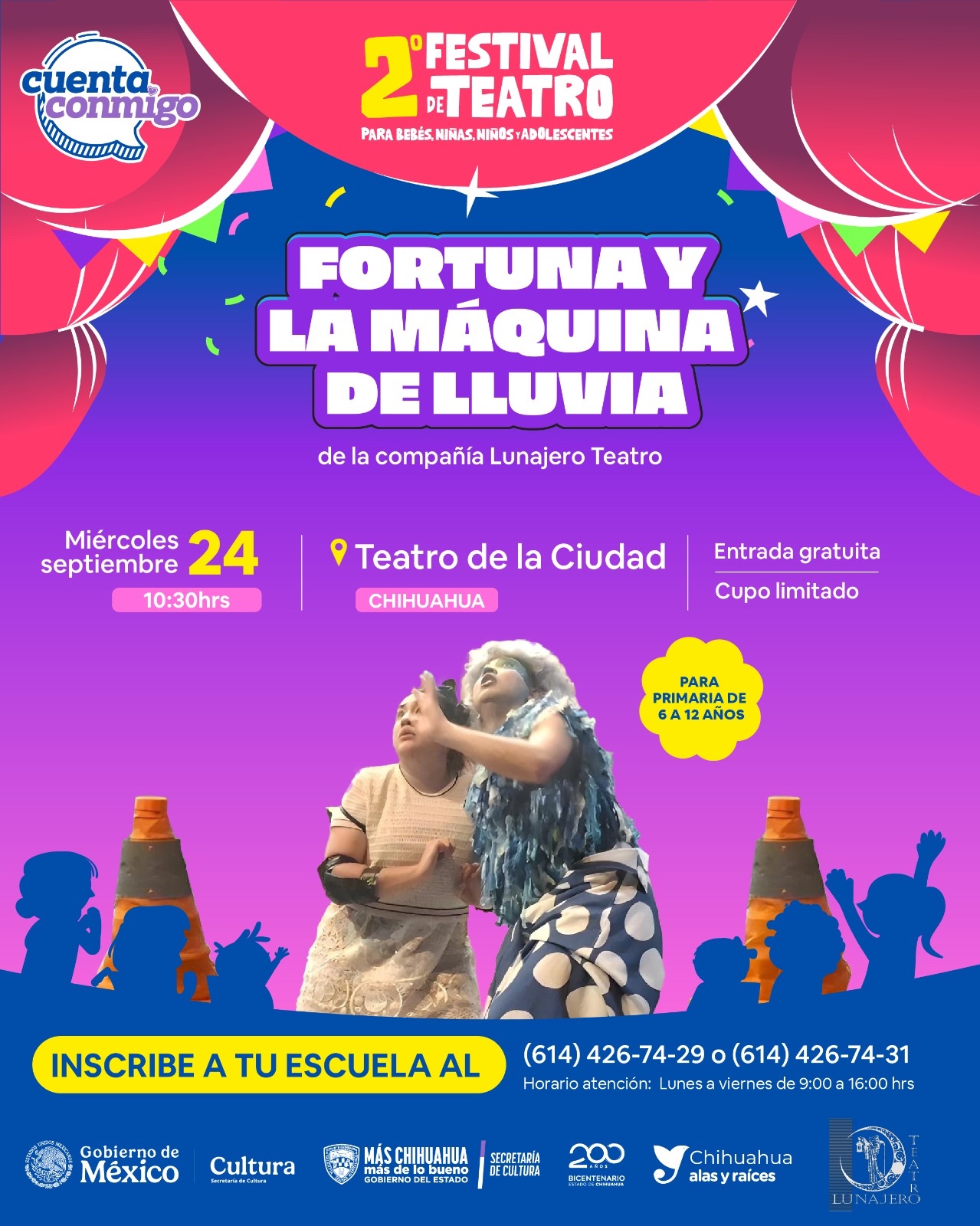 En tanto, para el miércoles 24 de septiembre, a las 10:30 en el Teatro de la Ciudad, “Lunajero Teatro”, llevará a niñas y niños de primaria, la obra “Fortuna y la Máquina de Lluvia”.