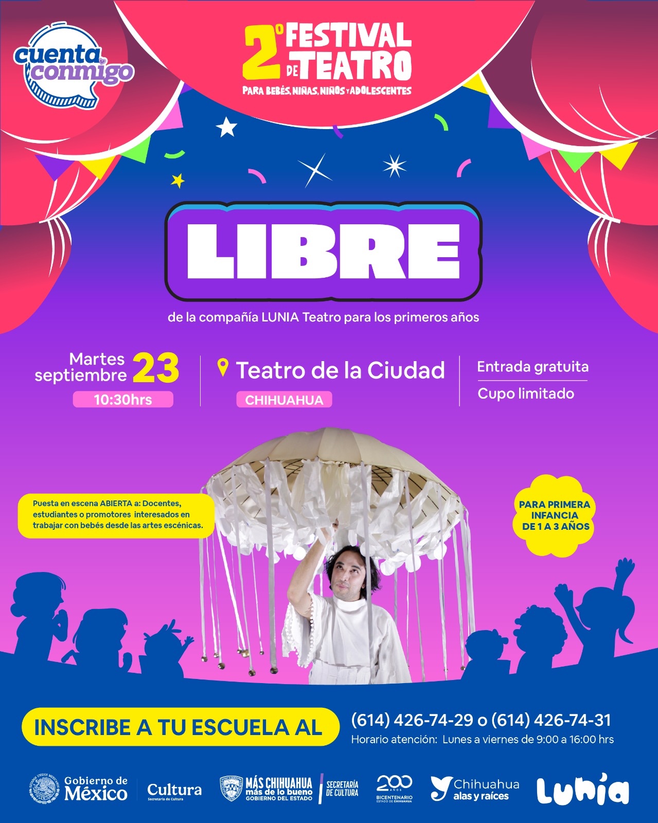 El martes 23 de septiembre a las 10:30 de la mañana, la compañía “Lunia” Teatro para los primeros años subirá a escena la obra “Libre”, dirigida a estudiantes de educación, teatro, puericultura, docentes y promotores interesados en trabajar con bebés desde las artes escénicas.