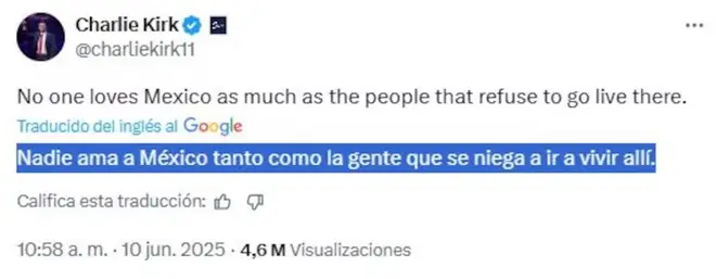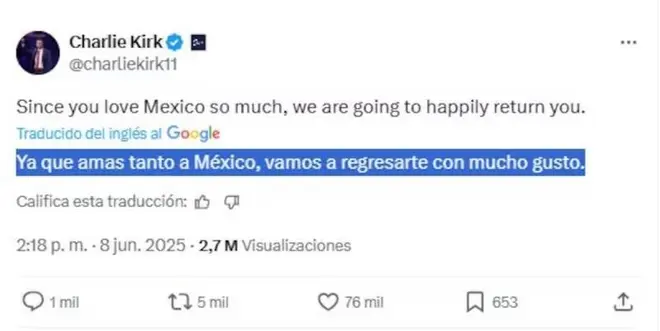 Sus opiniones, a menudo compartidas en redes sociales, reflejaban una visión ultranacionalista. En un tuit de 2025, Kirk escribió: “Ya que amas tanto a México, vamos a regresarte con mucho gusto”. Esta declaración, dirigida a migrantes mexicanos en Estados Unidos, sugería que quienes buscaban oportunidades en otro país debían regresar si expresaban apego por su nación.