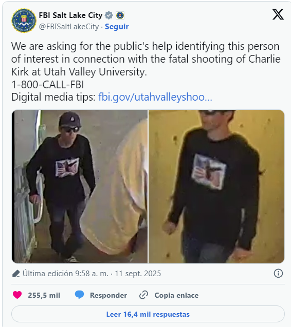 “Pedimos ayuda del público para identificar a esta persona de interés por el tiroteo fatal de Charlie Kirk. Llama al 1-800-CALL-FBI”, publicó en X.