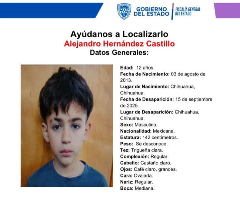La Fiscalía General del Estado lanzó una alerta para dar con el paradero de Alejandro Hernández Castillo, un niño de 12 años que fue reportado como desaparecido la