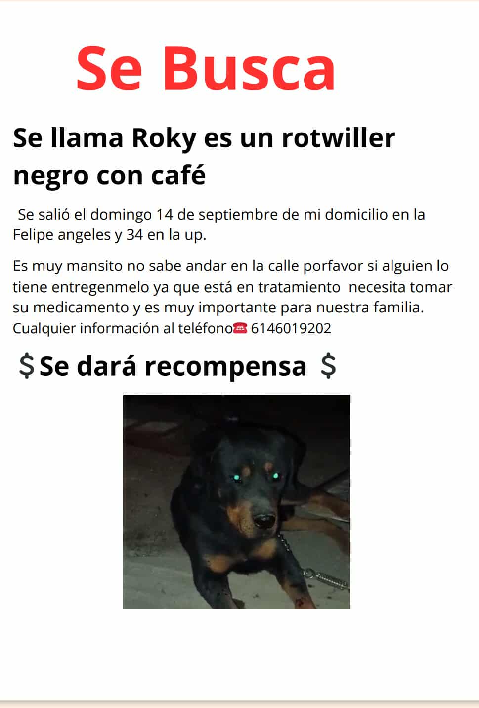 H. Cd de Chihuahua.- Una familia de la colonia UP solicita apoyo de la ciudadanía para localizar a su perro de raza rottweiler, de nombre Roky, que se extravió la mañana del domingo 14 de septiembre en el cruce de las calles Felipe Ángeles y 34.