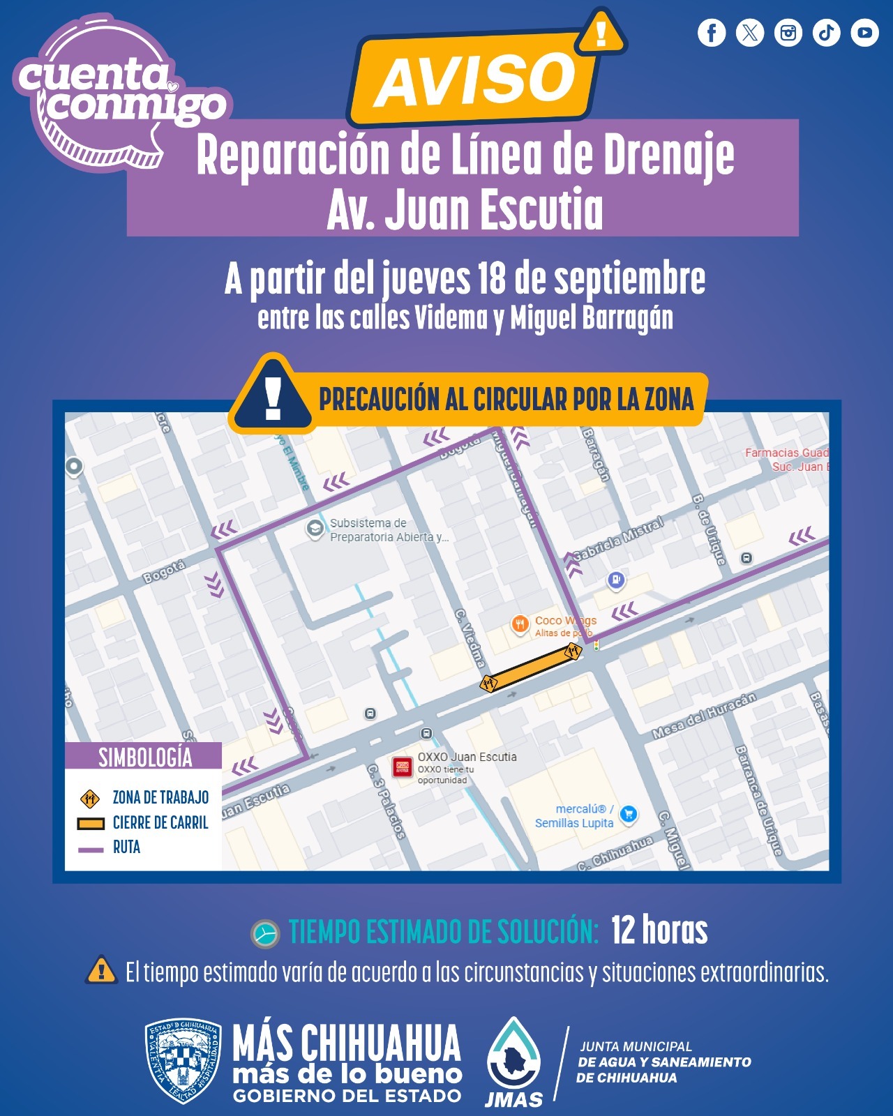 La Junta Municipal de Agua y Saneamiento (JMAS) de Chihuahua informó que este jueves 18 de septiembre llevará a cabo los trabajos de reparación de un tramo de
