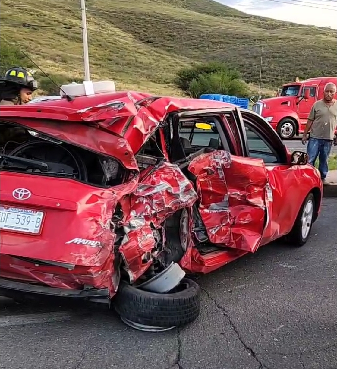 La tarde de este viernes se registró un aparatoso accidente vial sobre la carretera Francisco R. Almada, donde un vehículo compacto de la marca Toyota Matrix fue impactado