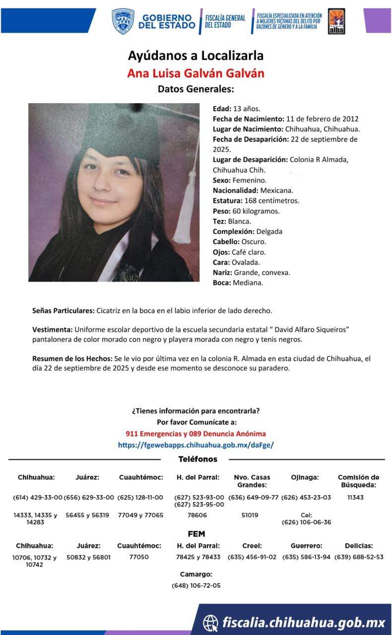 H. Cd. de Chihuahua.– La Fiscalía General del Estado emitió una alerta para localizar a Ana Luisa Galván Galván, de 13 años, desaparecida en la colonia R. Almada.