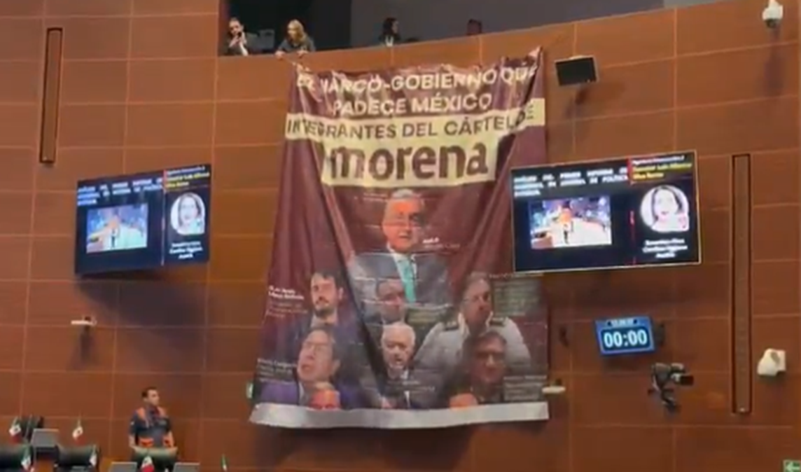 Durante la sesión de este miércoles 24 de septiembre de 2025 en el Senado de la República, legisladores del Partido Revolucionario Institucional (PRI) colgaron en el recinto una