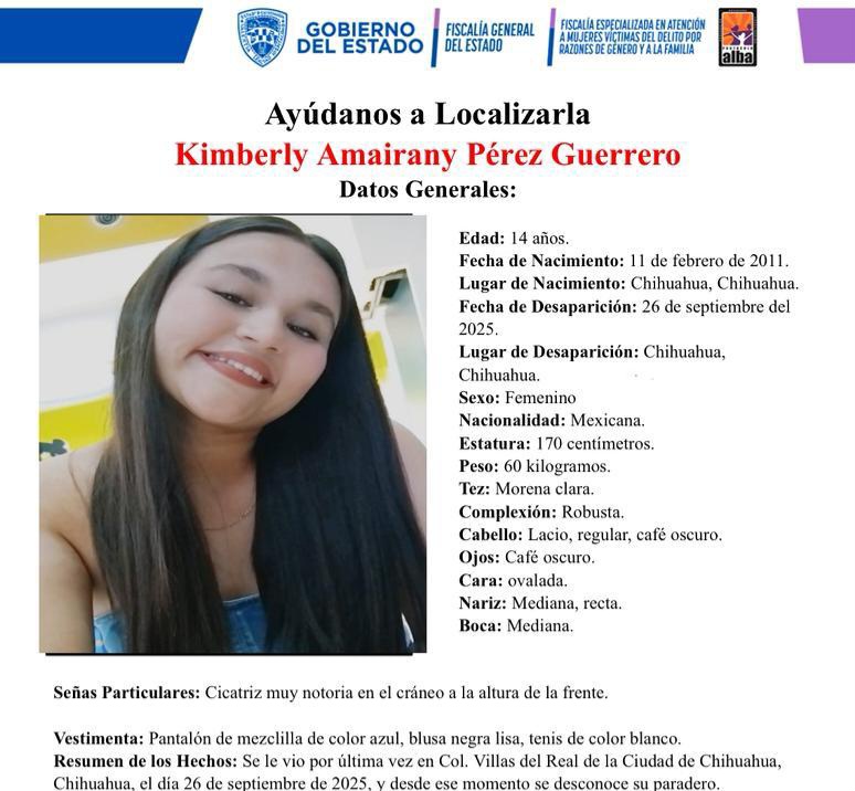 La Fiscalía General del Estado emitió una ficha de búsqueda para localizar a Kimberly Amairany Pérez Guerrero, de 14 años de edad, quien fue reportada como desaparecida en