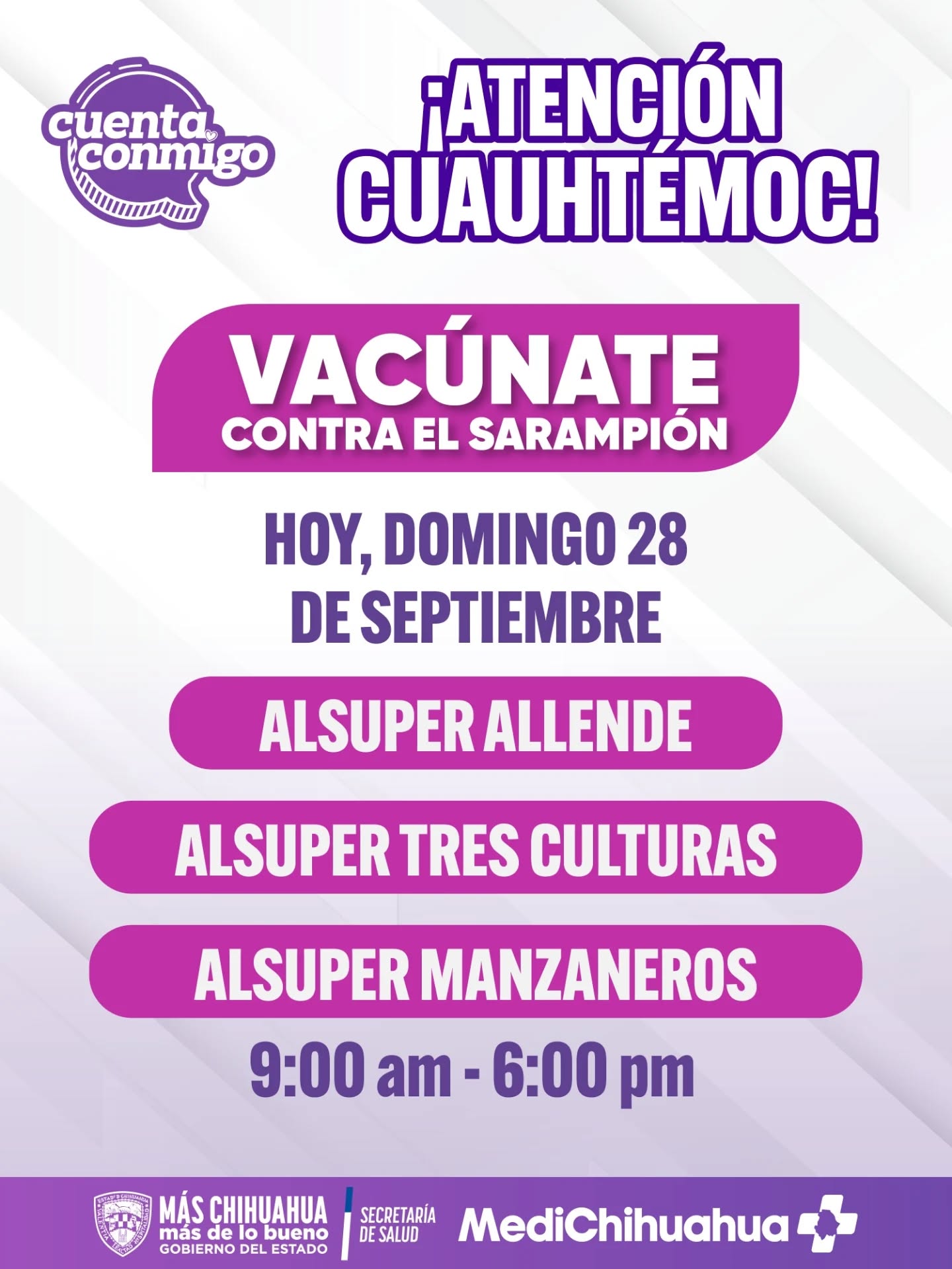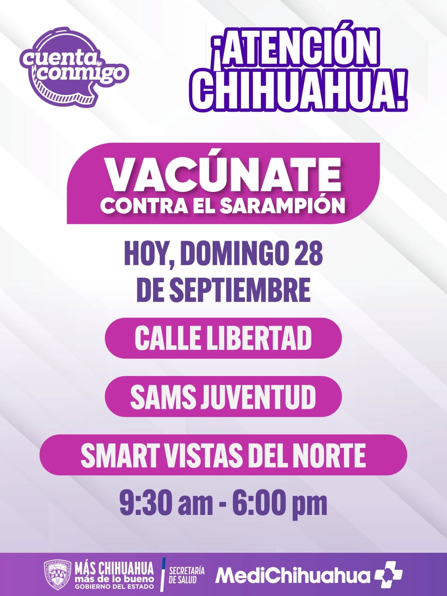 H. Cd. de Chihuahua.- Este domingo 28 de septiembre se llevará a cabo una jornada especial de vacunación contra el sarampión en los municipios de Ciudad Juárez, Chihuahua capital, Creel, Cuauhtémoc, Jiménez y Parral. Autoridades de salud invitan a la población a acudir a su punto más cercano y revisar los horarios disponibles en cada localidad.