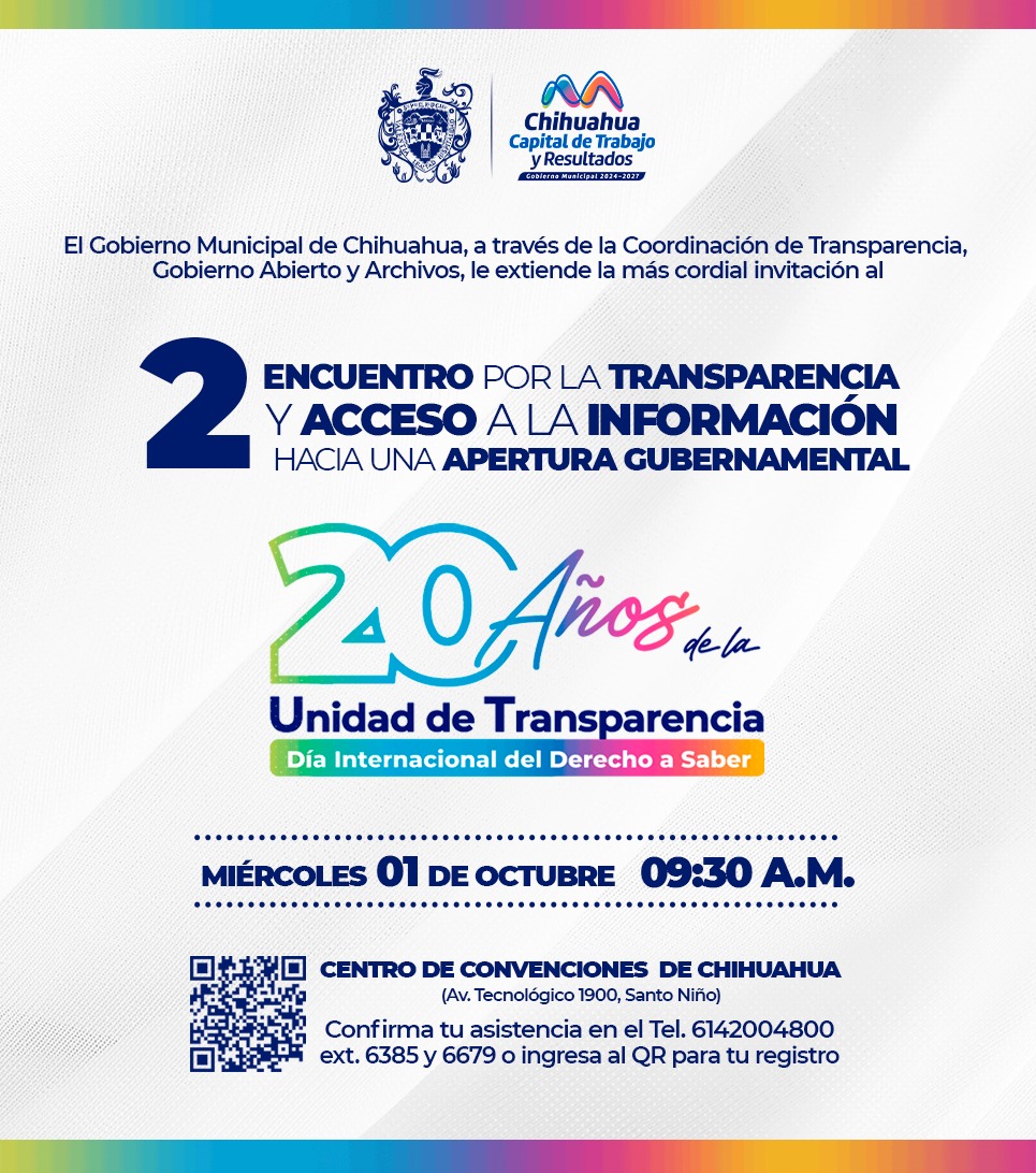 El Gobierno Municipal de Chihuahua, a través de la Coordinación de Transparencia, Gobierno Abierto y Archivos, invita al “Segundo Encuentro por la Transparencia y Acceso a la Información”, este 1 de octubre en Expo Chihuahua donde habrá conferencias magistrales y la presentación de un libro de gran relevancia en la materia.