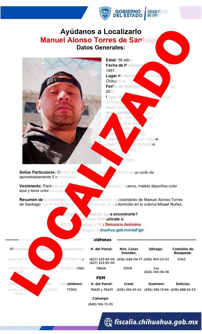 La Unidad de Investigación de Personas Ausentes y/o No Localizadas de la Fiscalía de Distrito Zona Centro (FDZC) localizó sano y salvo a Manuel Alonso T. S., de