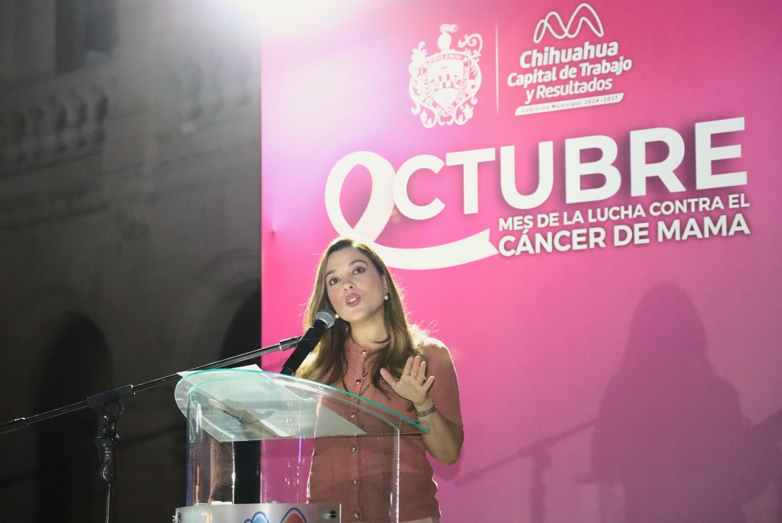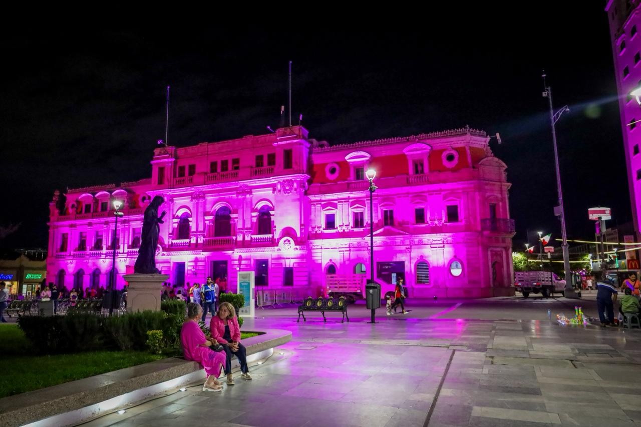 H. Cd. De Chihuahua.- El Gobierno Municipal iluminó de rosa los edificios de la Plaza de Armas y organizó una feria de servicios para concientizar sobre la importancia de la detección temprana del cáncer de mama.