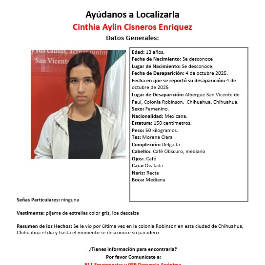 _H. Ciudad de Chihuahua, Chih., 4 de octubre de 2025._– Autoridades estatales activaron un operativo de búsqueda para localizar a **Cinthia Aylin Cisneros Enríquez**, de 13 años, quien fue reportada como desaparecida este sábado en la colonia Robinson, al norte de la ciudad.