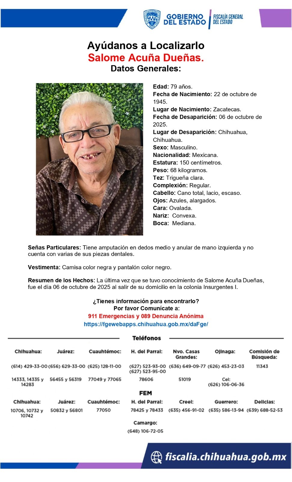 H. Cd de Chihuahua.- La Fiscalía General del Estado activó una alerta por la desaparición de Salomé Acuña Dueñas, de 79 años, quien supuestamente padece de demencia y podría encontrarse desorientado.