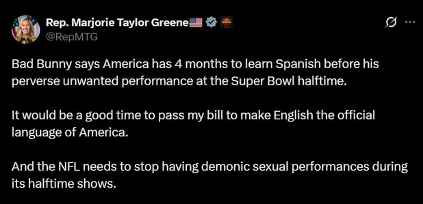 La congresista republicana Marjorie Taylor Greene reaccionó pidiendo al Congreso aprobar una ley para hacer del inglés el idioma oficial del país, asegurando que la NFL debería dejar de promover “actuaciones demoníacas” en sus espectáculos de medio tiempo. Su iniciativa, presentada en marzo, busca establecer que todos los ciudadanos naturalizados comprendan la Constitución en inglés.