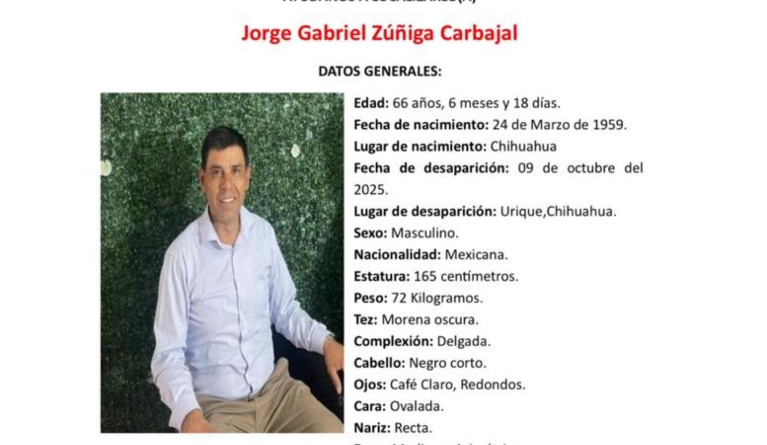 H. Cd de Chihuahua.- Autoridades estatales solicitaron la colaboración de la ciudadanía para encontrar a Jorge Gabriel Zúñiga Carbajal, trabajador del Instituto Nacional de Estadística y Geografía (INEGI),