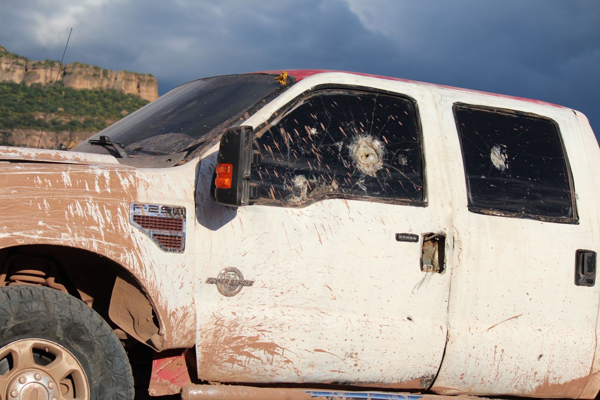 Durante la inspección, algunos vehículos presentaban impactos de arma de fuego de alto calibre, además de que uno de ellos, una Super Duty, contaba con insignias alusivas a un grupo criminal sobre una de sus puertas.
