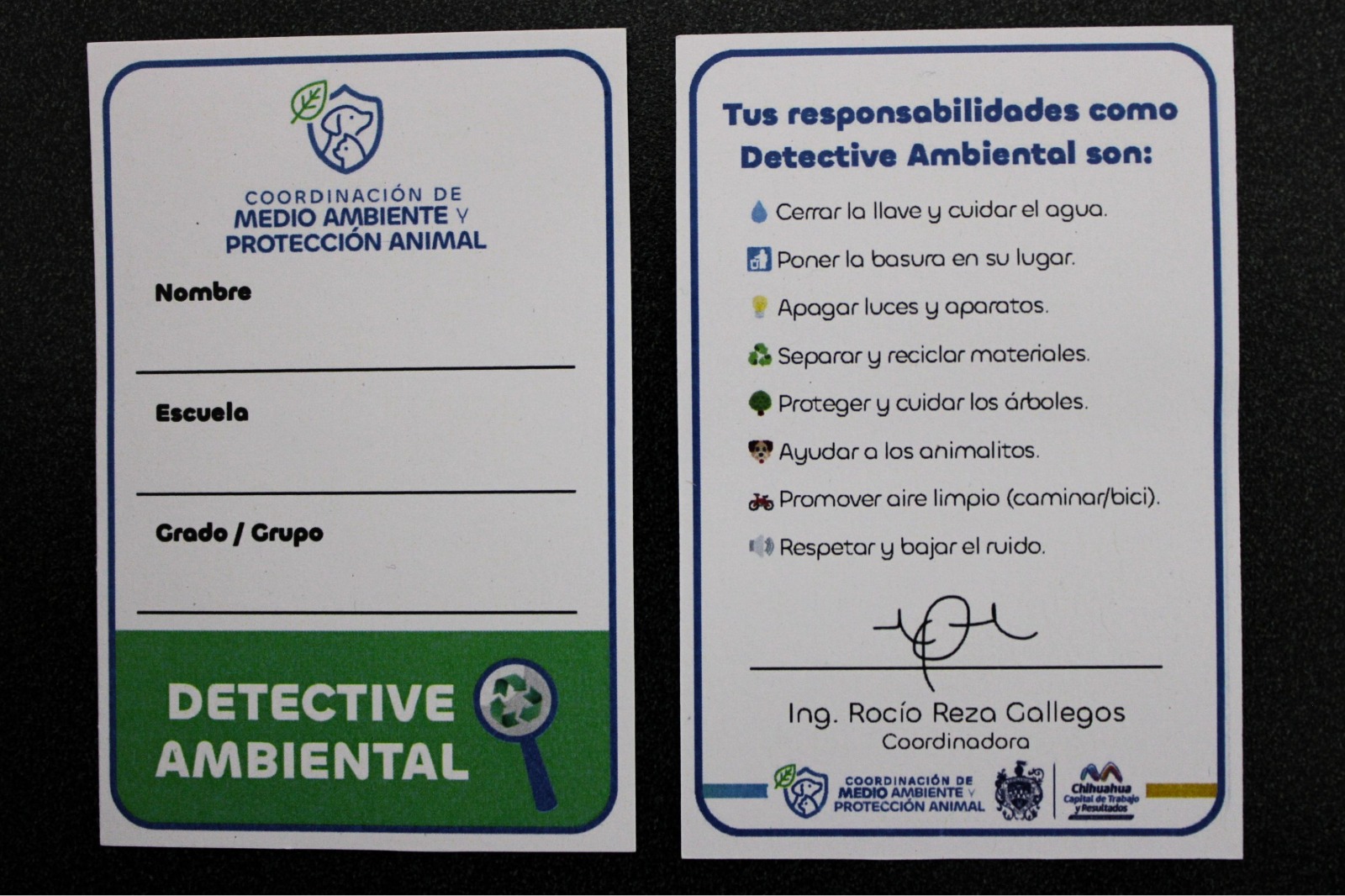 Las y los alumnos recibieron además una credencial que los acredita como Detectives Ambientales, en la que se enumeran sus principales responsabilidades: cuidar el agua, apagar luces y aparatos, separar materiales reciclables, mantener limpia su escuela y proteger a los árboles y animales.