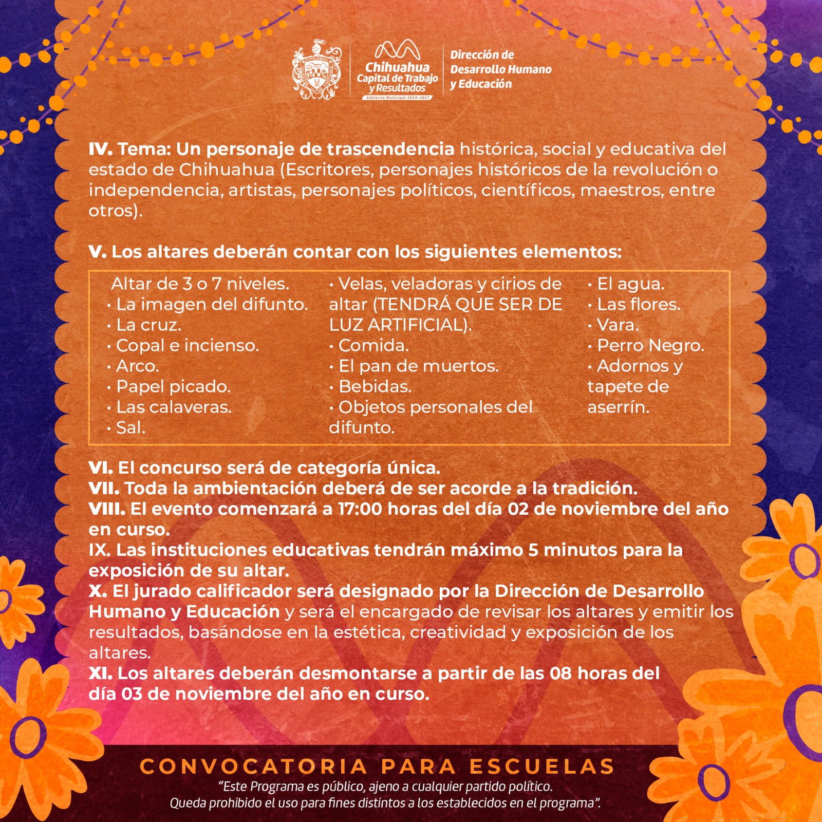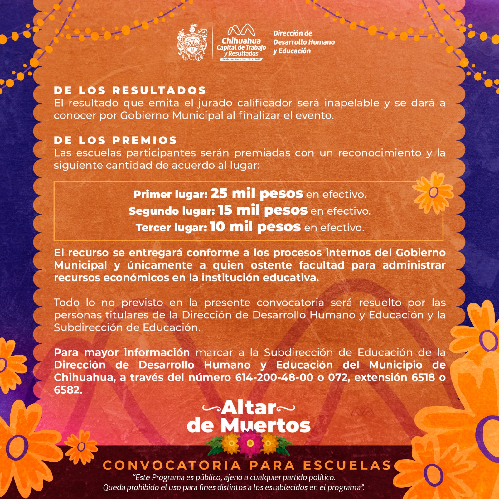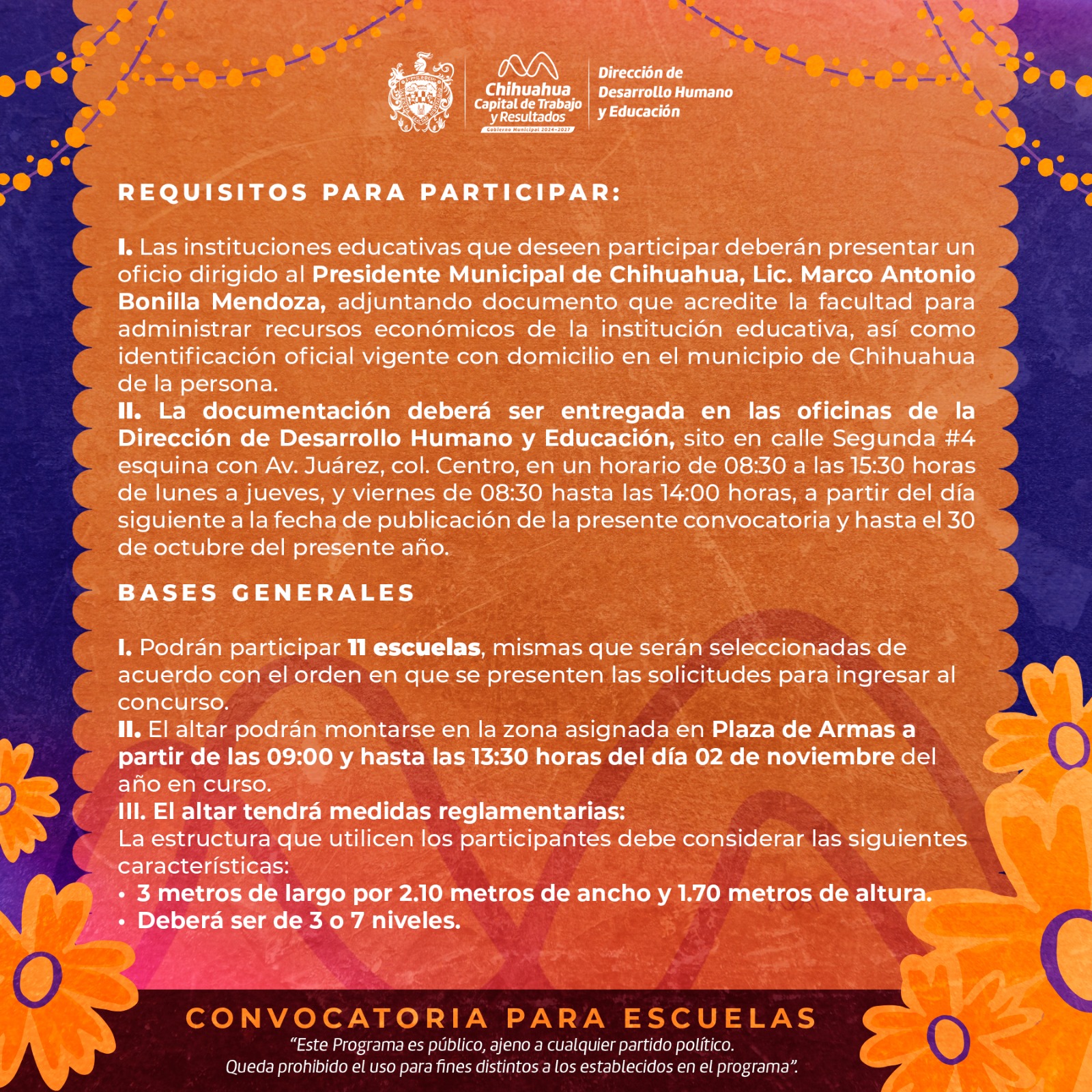 H. Ciudad de Chihuahua, Chih., 21 de octubre de 2025.– El Gobierno Municipal de Chihuahua, a través de la Dirección de Desarrollo Humano y Educación, te recuerda que aún estás a tiempo de inscribir a tu Institución Educativa en el Concurso de Altar de Muertos 2025.