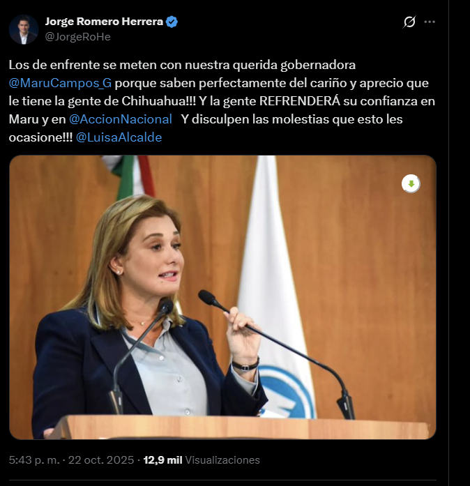 El líder panista utilizó sus redes sociales para lanzar un mensaje directo a los críticos de la gobernadora: “Los de enfrente se meten con nuestra querida gobernadora @MaruCampos_G porque saben perfectamente del cariño y aprecio que le tiene la gente de Chihuahua!!! Y la gente REFRENDARÁ su confianza en Maru y en @AccionNacional”. Romero concluyó el mensaje con una disculpa a la gobernadora por las molestias ocasionadas por los ataques: “Y disculpen las molestias que esto les ocasione!!! @LuisaAlcalde”.