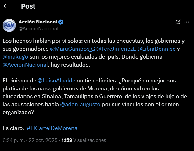 Este mensaje ocurre en medio de una confrontación directa con la presidenta nacional de Morena, Luisa María Alcalde, y se suma a la postura de la dirigencia nacional del PAN, que ha destacado el desempeño de sus gobiernos estatales. En un mensaje previo, el partido publicó: “Los hechos hablan por sí solos: en todas las encuestas, los gobiernos y sus gobernadores @MaruCampos_G @TereJimenezE @LibiaDennise y @makugo son los mejores evaluados del país. Donde gobierna @AccionNacional, hay resultados”.
