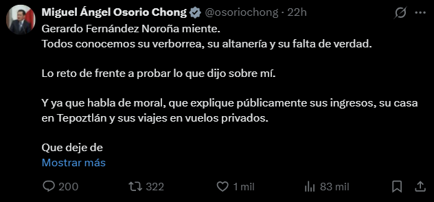 - El ex secretario de Gobernación, Miguel Ángel Osorio Chong, se sumó a las críticas, señalando: “Gerardo Fernández Noroña miente. Todos conocemos su verborrea, su altanería y su falta de verdad”. Osorio Chong lo retó a probar sus palabras y le exigió que, ya que habla de moral, explique públicamente sus ingresos, su casa en Tepoztlán y sus viajes en vuelos privados, pues “vives de la patraña”.