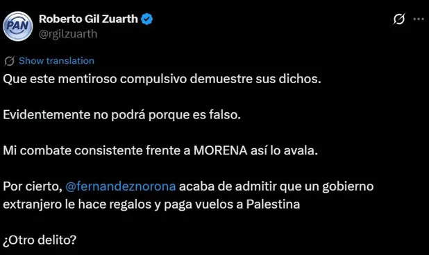 - Roberto Gil Zuarth respondió a Noroña, calificándolo de “mentiroso compulsivo” y retándolo a demostrar sus dichos, pues afirma que su “combate consistente frente a Morena” lo avala. Gil Zuarth también cuestionó a Noroña por admitir que un gobierno extranjero le hace regalos y paga vuelos a Palestina.