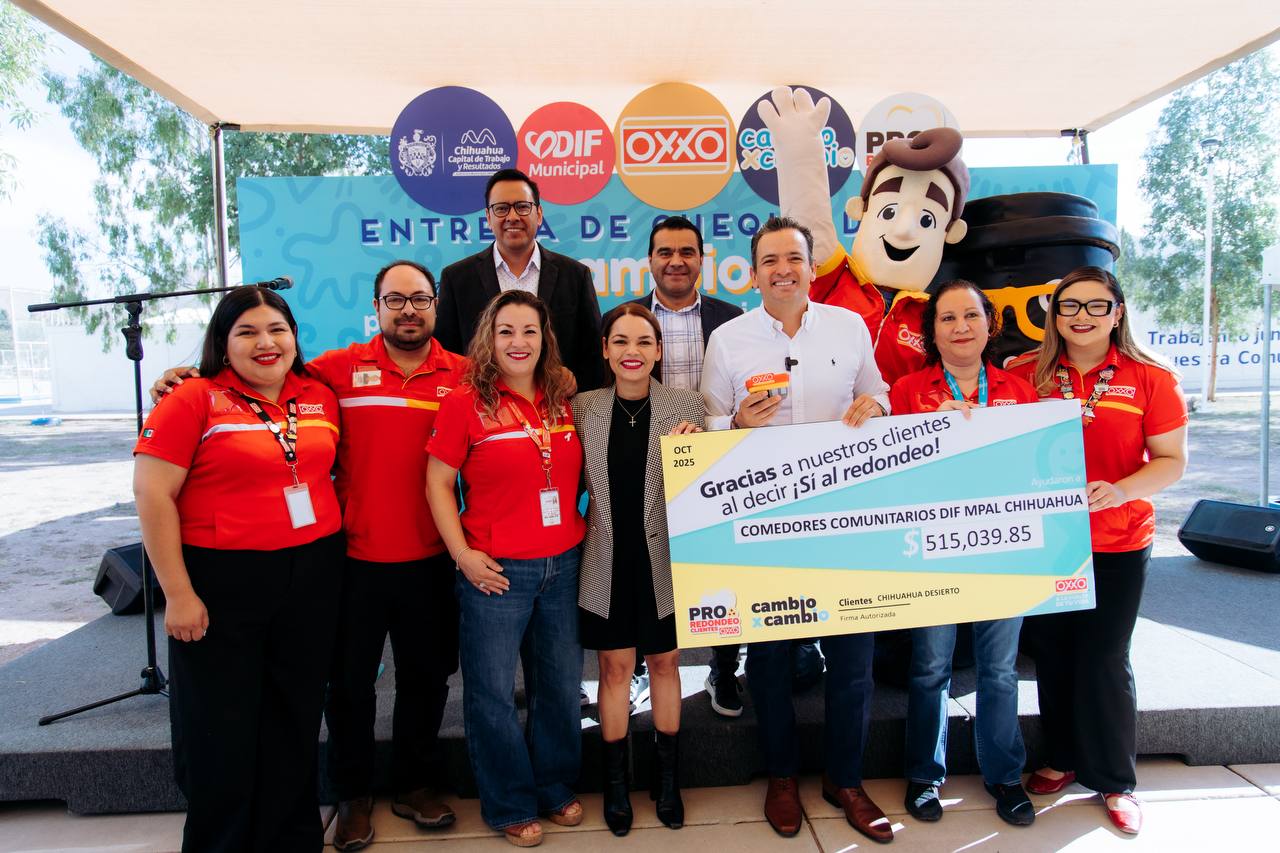 El alcalde Marco Bonilla y la presidenta del DIF Municipal, Karina Olivas, recibieron de la cadena comercial OXXO un cheque por 515 mil 39 pesos, recaudados a través del programa “Cambio x Cambio”, donde miles de chihuahuenses dijeron “sí” al redondeo durante tres meses en más de 300 tiendas de la plaza Chihuahua Desierto.